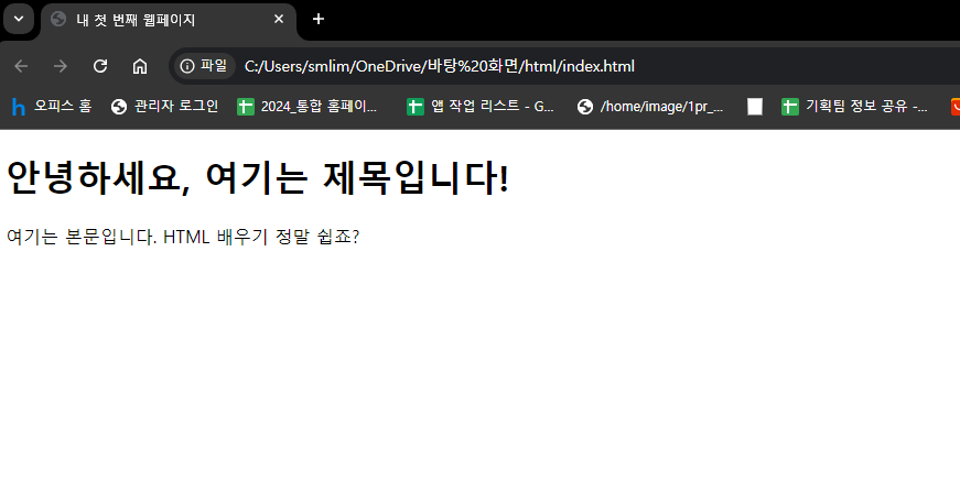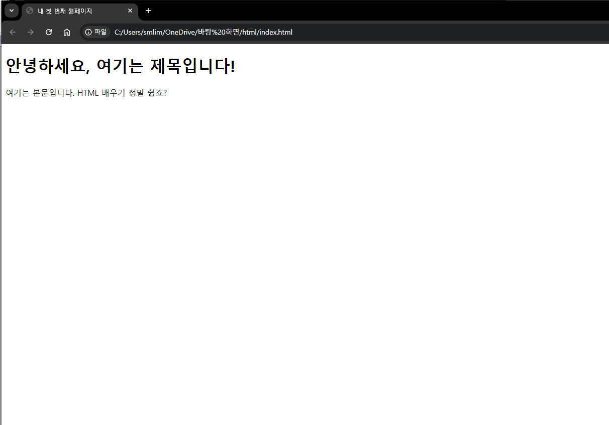 6. 성공적으로 첫번째 웹 페이지를 만들 수 있습니다! 생각보다 html 코딩 별 거 없죠?
