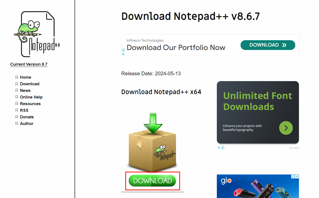 - Notepad++ 다운로드 페이지로 이동하세요: https://notepad-plus-plus.org/downloads/v8.6.7/