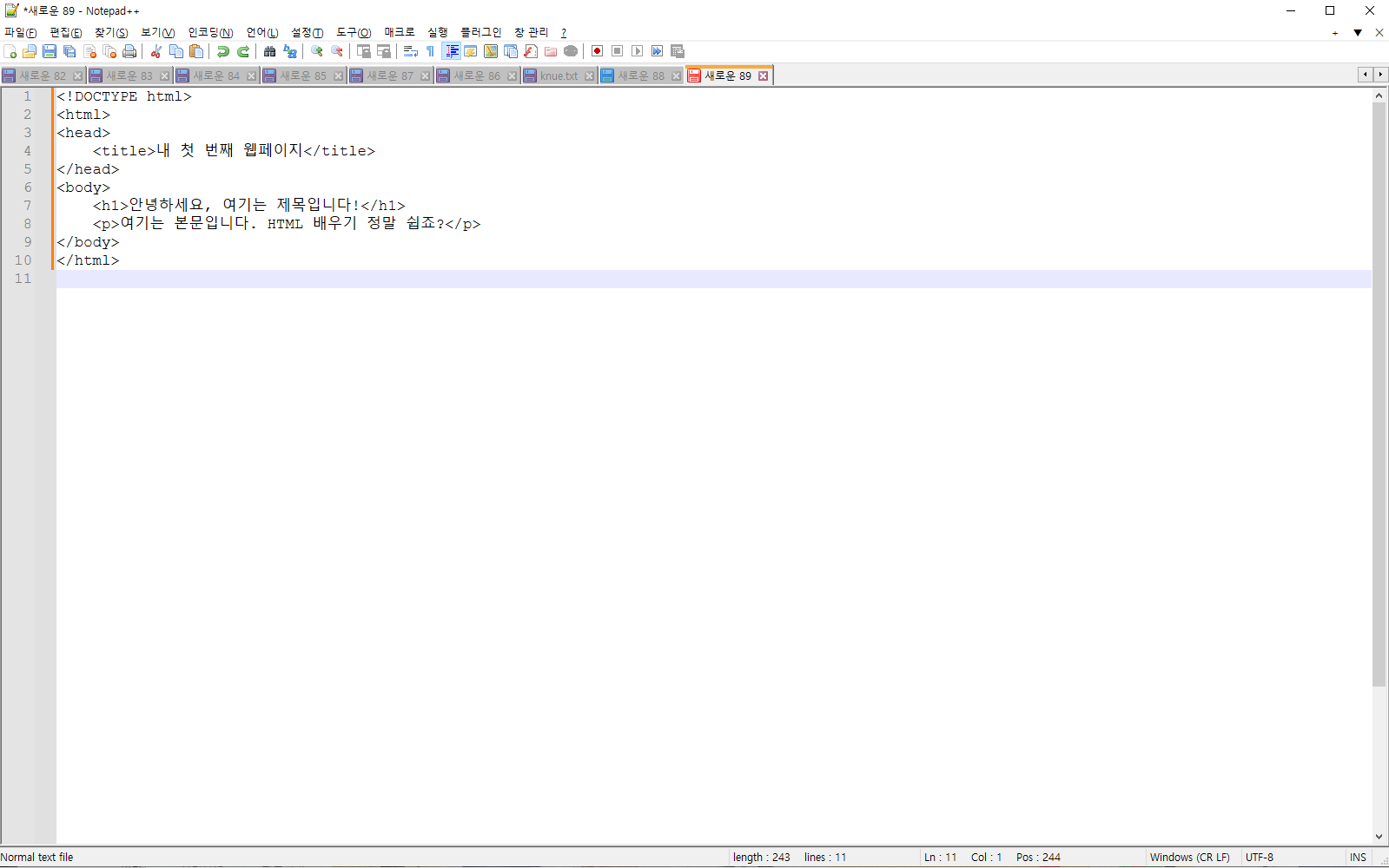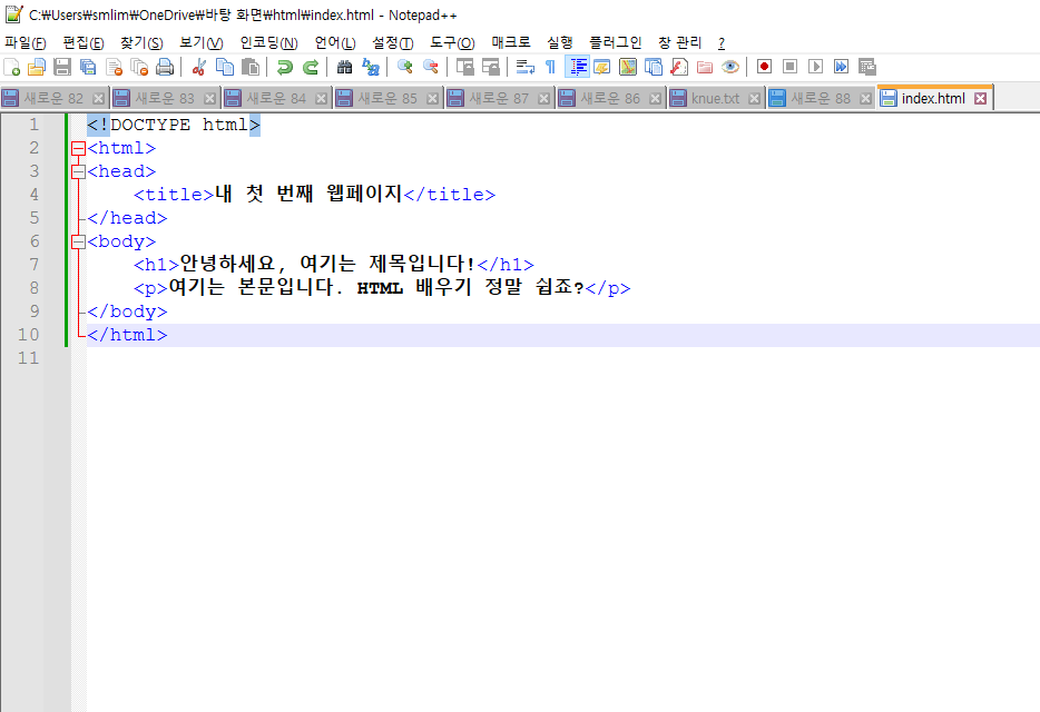 이제 **Notepad++**를 열고, 위에 있는 HTML 코드를 직접 입력해보세요! 입력이 끝나면 **"파일 → 다른 이름으로 저장"**을 선택하고, 파일 이름을 **index.html**로 저장한 다음, 브라우저에서 열어보세요.